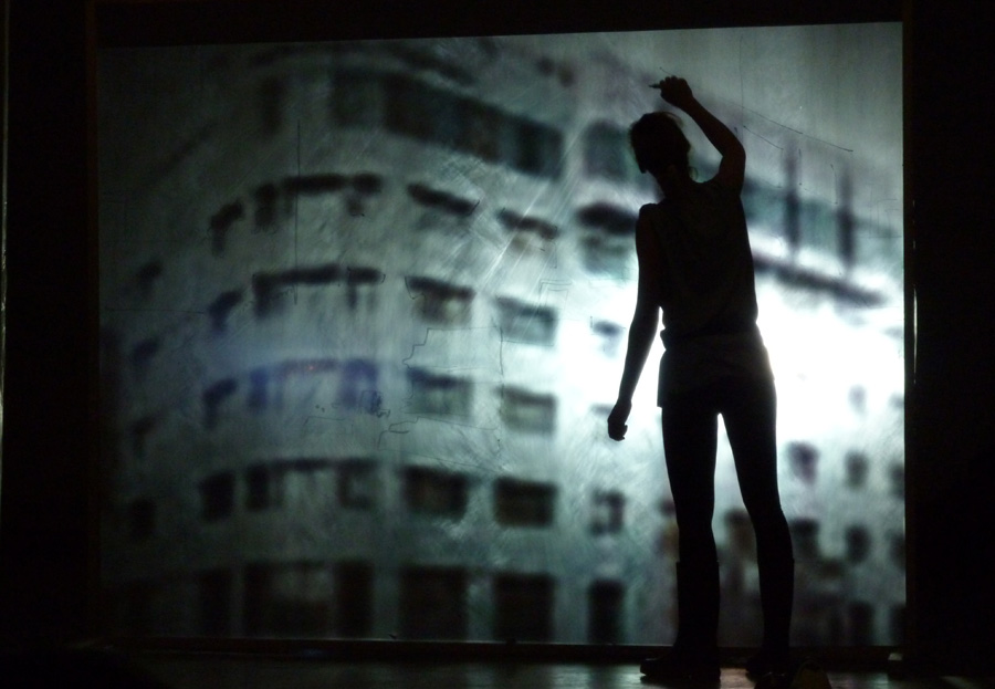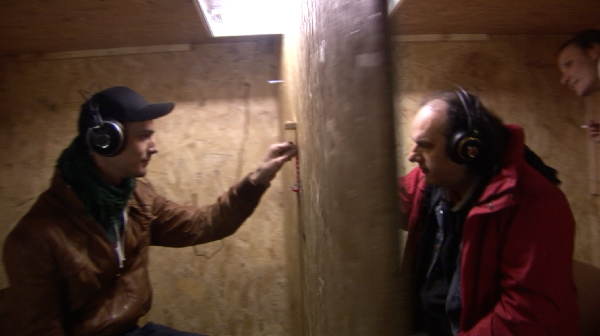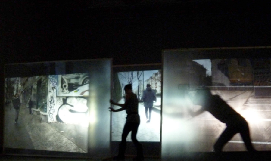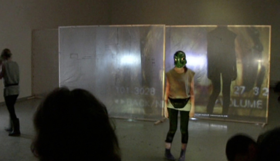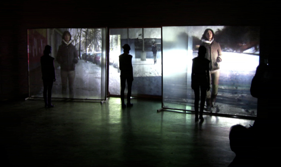 By playing the videos (forwards / backwards) an audio collage was triggered. The 3 performers synchronized the movement of the video within the space.